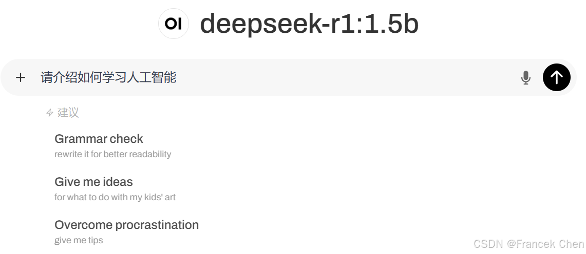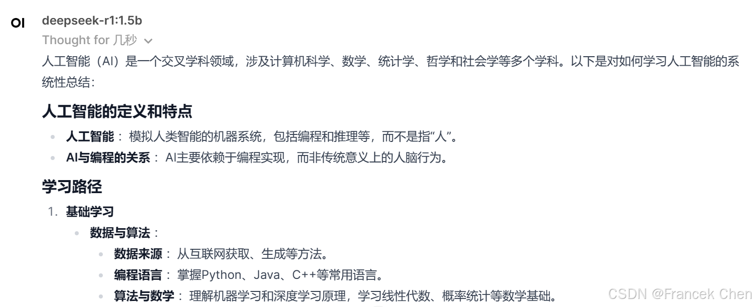 在Open WebUI界面中,选择已下载的DeepSeek R1模型,即可开始对话测试。如图15所示,可以在对话框中输入“请介绍如何学习人工智能”然后回车,页面就会给出DeepSeek R1的回答结果(如图16所示)。