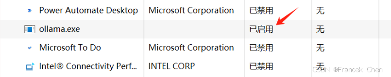 在Windows10系统中,输入快捷键Win + R,再在弹出的对话框中输入“msconfig”并回车,进入如图17所示系统设置界面,点击“启动”选项卡,在这个选项卡中点击“打开任务管理器”,进入如图18所示的任务管理器界面,在界面中,找到“ollama.exe”,把鼠标指针放到“已启动”上面,单击鼠标右键,在弹出的菜单中点击“禁用”,然后关闭任务管理器界面。经过这样设置以后,Ollama以后就不会开机自动启动了。