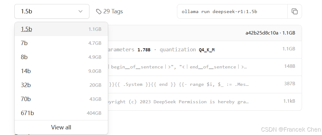 当然,我们可以不用到这个下载地址手动下载,只需要在cmd命令行窗口中执行如下命令就可以自动下载DeepSeek R1大模型: