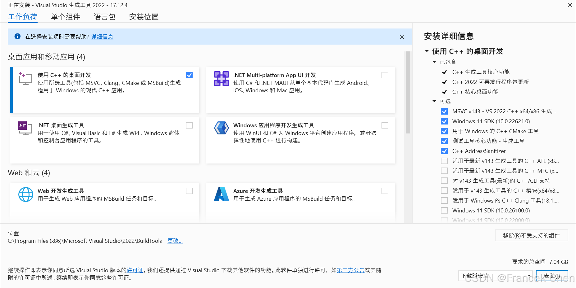 下载完成以后,双击安装包文件vs_BuildTools.exe进行安装,在弹出的安装界面中(如图10所示),在界面左上角的“桌面应用和移动应用”下方,选中“使用C++的桌面开发”,然后,点击界面右下角的“安装”按钮,完成安装。