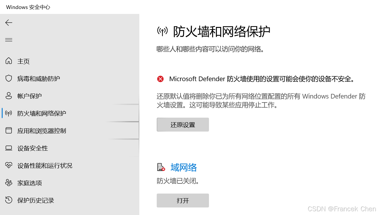 启动后,在浏览器中访问http://localhost:8080/即可进入Open WebUI界面。如果网页显示“拒绝连接”,无法访问Open WebUI界面,一般是由于你的计算机开启了Windows防火墙,可以点击“开始”菜单按钮,在弹出的界面中,在顶部的搜索框中输入“安全中心”(如图13所示),打开“Windows安全中心”,点击左侧的“防火墙和网络保护”,在右侧的“域网络”中,关闭防火墙。