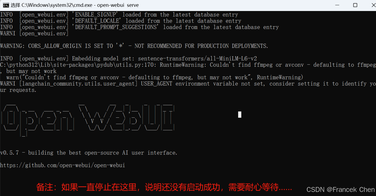 再新建一个cmd命令行窗口,在cmd命令行窗口中执行如下命令启动Open WebUI服务: