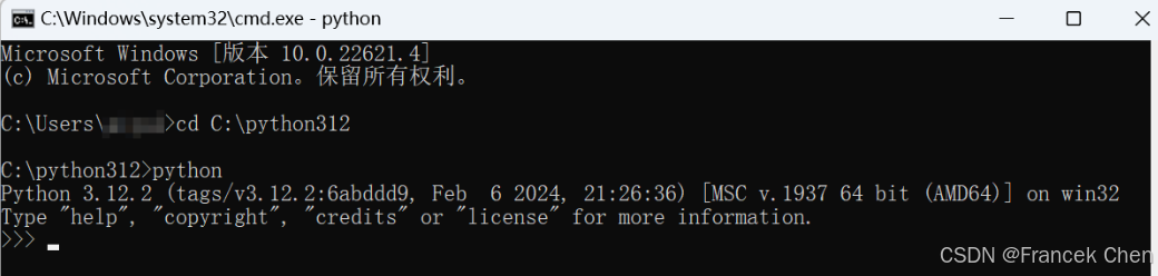 安装完成以后,需要检测是否安装成功。可以打开Windows操作系统的cmd命令界面,然后执行如下命令打开Python解释器: