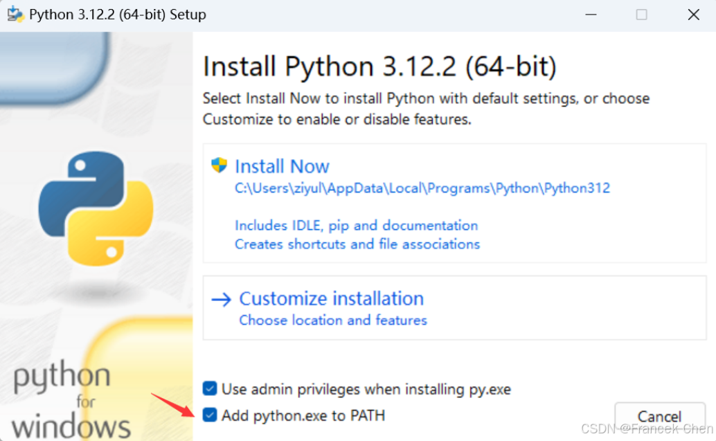 Python可以用于多种平台,包括Windows、Linux和MacOS等。这里使用的Python版本是3.12.2(该版本于2024年2月6日发布),不要安装最新的3.13版本。请到Python官方网站下载(官网下载地址)与自己计算机操作系统匹配的安装包,比如,64位Windows操作系统可以下载python-3.12.2-amd64.exe。运行安装包开始安装,在安装过程中,要注意选中“Add python.exe to PATH”复选框,如图7所示,这样可以在安装过程中自动配置PATH环境变量,避免了手动配置的烦琐过程。