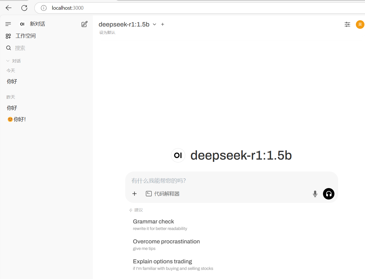 ollama run deepseek-r1:1.5bdocker run -d -p 3000:8080 --add-host=host.docker.internal:host-gateway -v open-webui:/app/backend/data --name open-webui --restart always ghcr.io/open-webui/open-webui:main访问:http://localhost:3000/