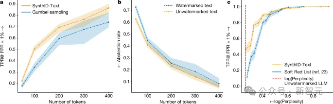 上图表明,在非失真类别中,对于相同长度的文本,非失真SynthID-Text提供比Gumbel采样更好的可检测性。在较低熵的设置(如较低的温度)下,SynthID-Text对Gumbel采样的改进更大。