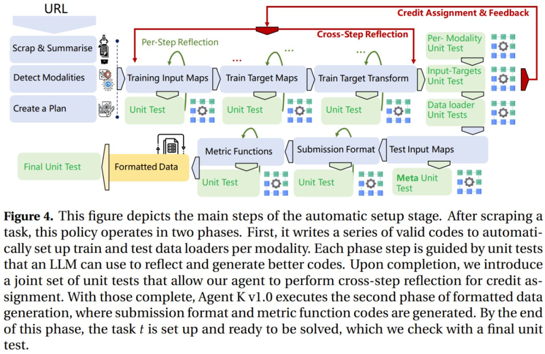 选择了任务之后,Agent K v1.0 会使用 π_setup (・) 自动执行标准化、清理任务数据、 准备训练和测试指标等操作。这个过程同样基于 RAG_j。