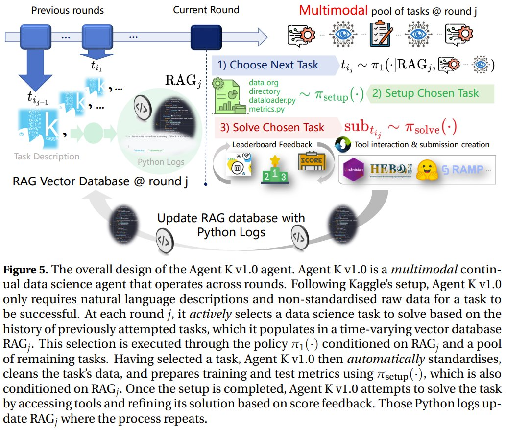 按照 Kaggle 的设置,Agent K v1.0 只需要自然语言描述和非标准化原始数据即可成功完成任务。在每一轮 j 中,它会根据之前尝试过的任务的历史记录主动选择要解决的数据科学任务,并将其填充到随时间变化的向量数据库 RAG_j 中。这种选择是策略 π_1 (・) 基于 RAG_j 和一个剩余任务池执行的。