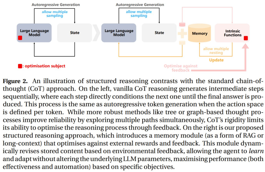 右侧是新提出的结构化推理方法,它引入了一个记忆模块(作为 RAG 或长上下文的一种形式),可以根据外部奖励和反馈进行优化。该模块可根据环境反馈动态地修改存储的内容,让智能体可在不改变底层 LLM 参数的情况下学习和适应,进而根据具体目标最大限度地提高性能(有效性和自动化)。