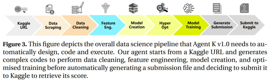 下图展示了 Agent K v1.0 实现自动设计、编程和执行所需的整体数据科学工作流程:首先从一个 Kaggle URL 开始,再生成执行代码清理、特征工程、模型创建和优化训练的复杂代码,之后再自动生成一个提交文件,并将其提交给 Kaggle 以获得分数。