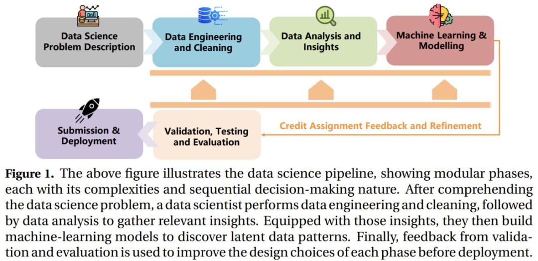 举个例子,在 Kaggle 数据科学竞赛中(如图 1 所示),数据科学家需要遵循一个结构化的工作流程:收集、清理、预处理和标准化数据,创建数据加载器以实现高效管理,生成关键评估指标,以及开发自定义模型。然后,这些见解和预测可以为决策和优化提供信息。因此,为了解决这些工作流程,需要数据科学智能体将任务分解为子问题并与各种子系统交互以实现指定目标。