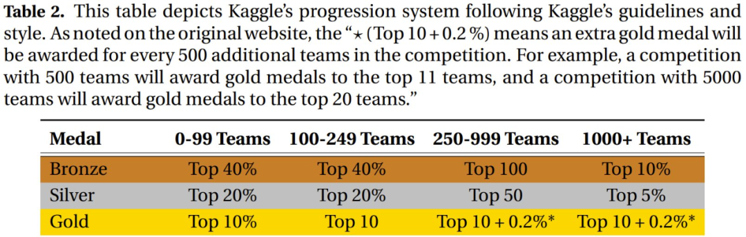 下表则是基于 Kaggle 的指南和风格构建的 Kaggle 进展系统。⋆ (Top 10 + 0.2 %) 是指竞赛每增加 500 个参赛队伍,就会额外给出一枚金牌。举个例子,如果一个竞赛有 500 个参赛队伍,则会给 11 团队授予金牌。而如果竞赛队伍有 5000 个,则金牌数会达到 20。
