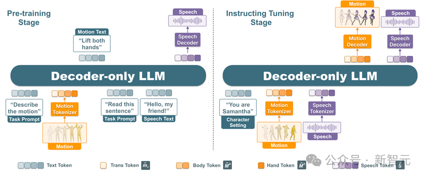 如图所示,SOLAMI中所有角色的驱动都是由一个统一的端到端VLA多模态模型驱动。给定角色的设定,模型以用户的语音和动作作为输入,将这两种模态通过Motion Tokenizer和Speech Tokenizer分别编码为LLM新的词表中的token,LLM基座会自回归输出角色的语音和动作token,再通过解码器分别解码为角色的3D动作和语音,来驱动角色做出反应。