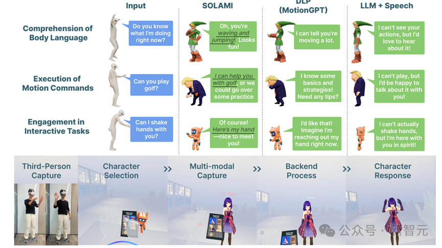 1. 3D角色需要准确观察和理解用户行为信息,并基于上下文和角色设定通过语音、肢体动作和表情做出合适的回应。这已经超越了之前的单一任务(动作理解,动作生成,语音驱动肢体等)的范畴。