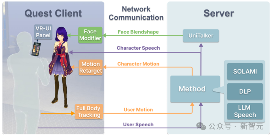 在交互时,VR头显会实时捕捉用户的语音和全身动作,发送给后端。后端运行SOLAMI模型,生成角色的语音、肢体动作和面部表情响应,发送给前端来驱动角色。