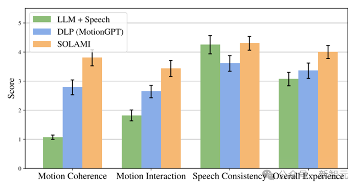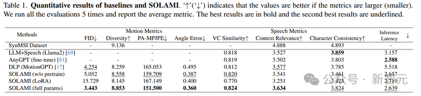 为此,研究人员选择了两种对比方法:LLM+Speech,DLP(MoitonGPT)。前者是纯语音的交互,后者是LLM-Agent结构驱动的数字角色。为了保证公平,这些方法的基座模型都是llama2-7B,并使用vLLM部署进行加速。