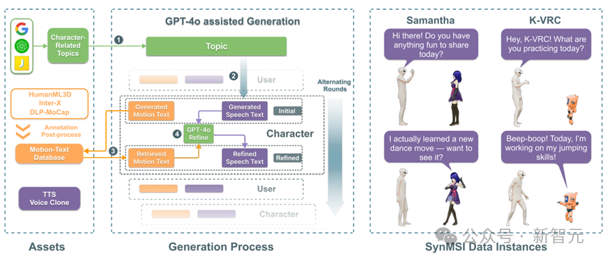 首先,研究人员基于公开的动作-文本数据集构建了一个大规模的带有语义标注的动作库,包含4万多个人体动作,然后使用GPT-4o生成角色和用户对话的纯文本的台词剧本。