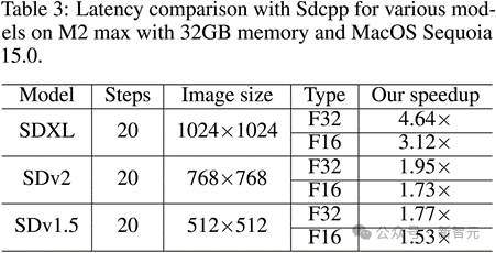 图像分辨率越大,方法的加速效果越明显。在生成1024×1024分辨率图像时,相比于原版Sdcpp,优化后的Sdcpp在M1 Pro以及M2 Max上的推理速度提升可超过4.6 倍(FP32 类型)。