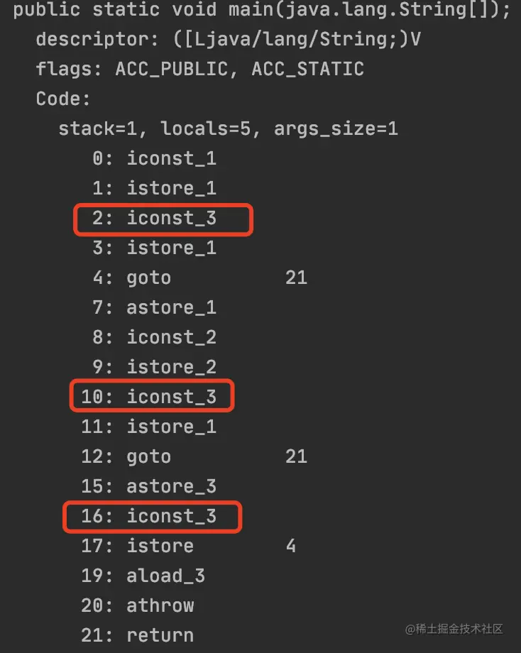 发现,存在多个iconst_3(iconst指令将常量压入栈,iconst_3代表把常量3压入栈中)