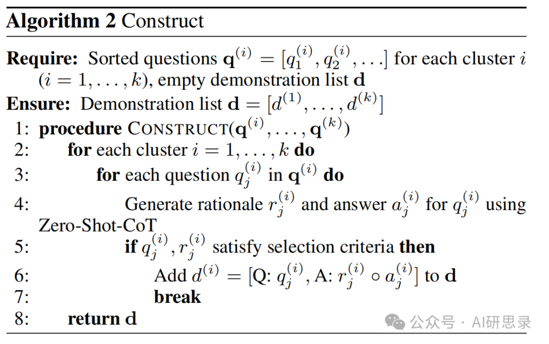 对于簇 ,我们在排序后的列表中迭代问题,直到满足我们的选择标准。换句话说,离簇 中心更近的问题会被优先考虑。假设第 近的问题 正在被考虑,通过到零样本推理链,输入到大模型中,得到包含推理过程和提取的答案的推理链。然后,通过将问题、推理过程和答案连接起来,构建了第 个簇的候选演示。
