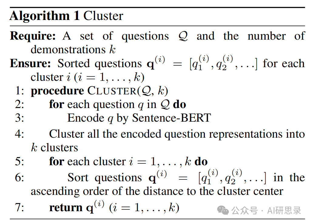 由于基于多样性的聚类可能会减少由相似性导致的误导,我们针对给定的问题集合 执行聚类分析,。我们首先使用Sentence-BERT为 中的每个问题计算一个向量表示。随后,这些问题表示被 k-means 聚类算法处理,以产生 个问题簇。对于簇 中的每个问题,我们将它们按照到簇 中心的距离升序排列成列表,。