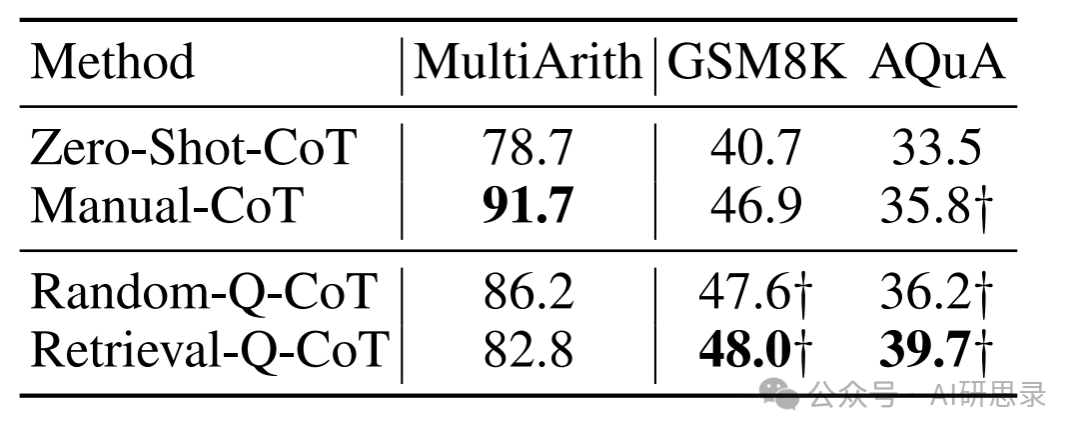 从实验结果来看,在调用Zero-Shot-CoT时,Retrieval-Q-CoT在算术数据集MultiArith上的表现不如Random-Q-CoT,而在带有注释推理链的GSM8K和AQuA两个数据集上,Retrieval-Q-CoT甚至优于Manual-CoT。结果表明,Retrieval-Q-CoT的较差性能是由Zero-Shot-CoT的错误推理链引起的。