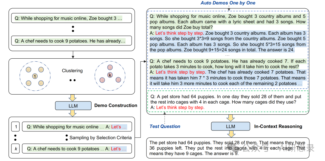 这篇文章提出了自动思维链(Auto-CoT),先将问题聚类,每一类中抽出一个具有代表性的问题,利用零样本思维链为每个问题生成推理链。例如:一共有K个聚类,会抽取K个问题,用提示词“让我们一步一步地思考”,生成K套思维链步骤。当向大模型提出一个新问题后,系统将K套思维链步骤作为提示词和新问题一并输入大模型,并完成作答。