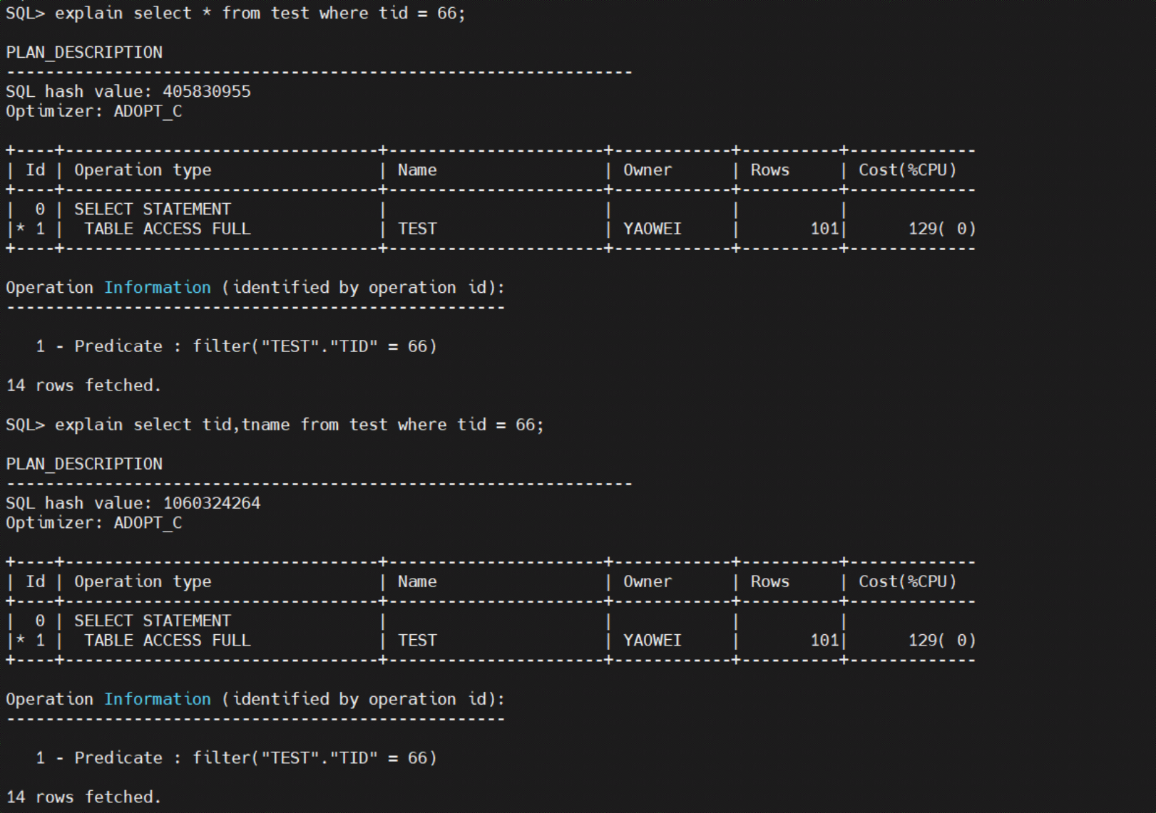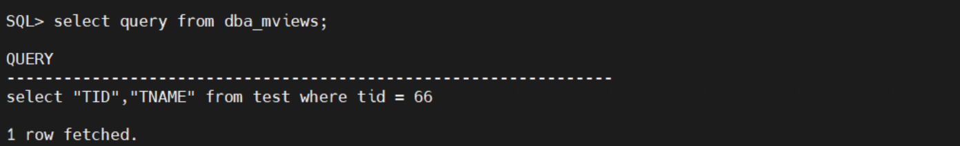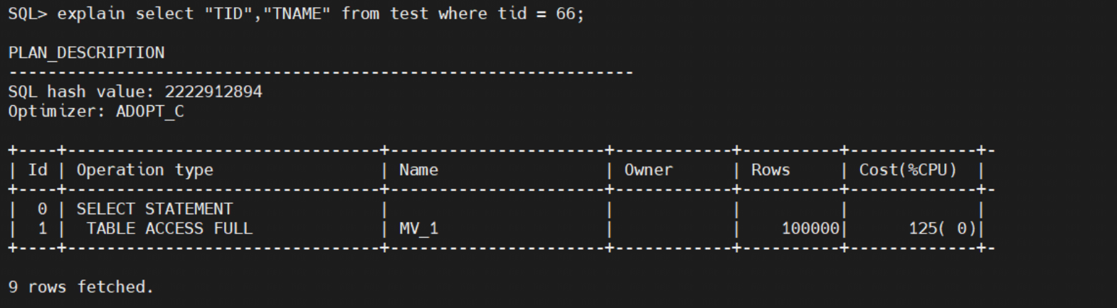 alter materialized view mv_1 enable query rewrite;使用 select * from test where tid = 66 以及 select tid,tname from test where tid = 66,均无法进行查询重写:
