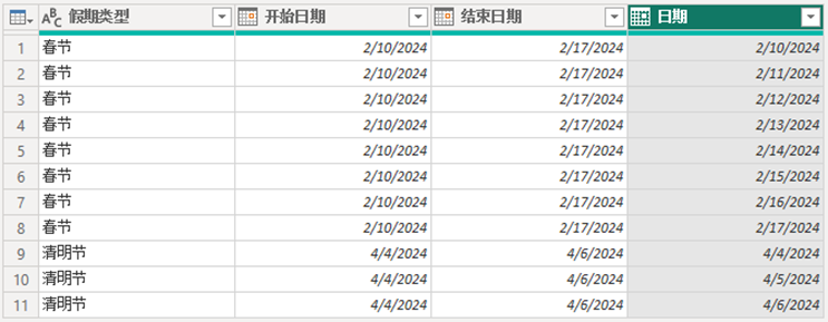 List.Dates([开始日期],Duration.Days([结束日期]-[开始日期])+1,#duration( 1, 0, 0, 0 ))