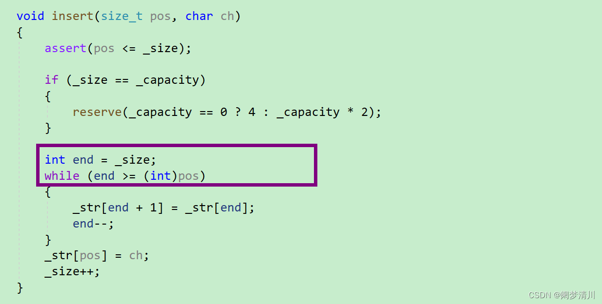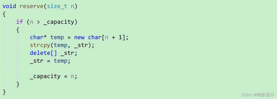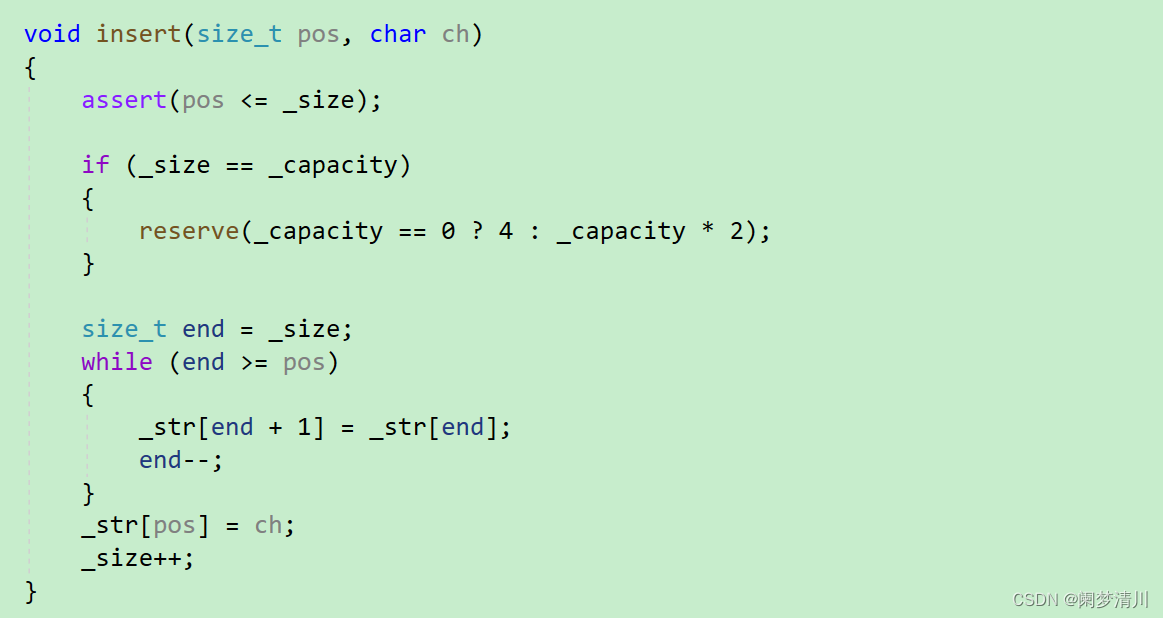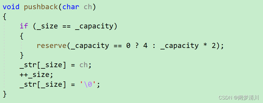 这个函数主要是在这个末尾插入字符的,这个里面就是用了reserve函数进行扩容的,判断条件里面的size==capacity说明这个时候的元素个数正好等于空间的大小,这个时候我们才需要进行扩容