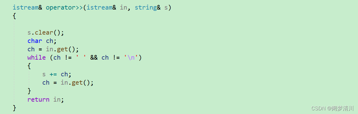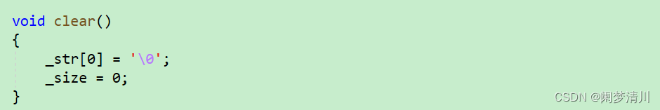 因为在这个cin重载里面,我们使用的是+=运算符,所以我们需要进行这个清空的操作,因此这个时候我们需要搞一个clear函数出来,不然的话,这个就会在原来的基础上面去尾插字符串,不符合我们的要求,clear函数的设计也是很简单的,就是把这个数组的第一个元素修改为斜杠0,size改为0即可。