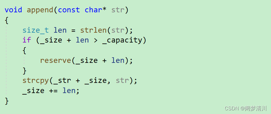 这个函数针对字符串进行尾插入,我们首先还是要进行判断这个字符串插入之后空间是否足够,超过空间大小的话我们就应该进行扩容了,大小就是这个size+len的字节大小,然后再把这个形参str从_str+_size的位置开始进行拷贝,最后使用重载运算符进行size的更新;