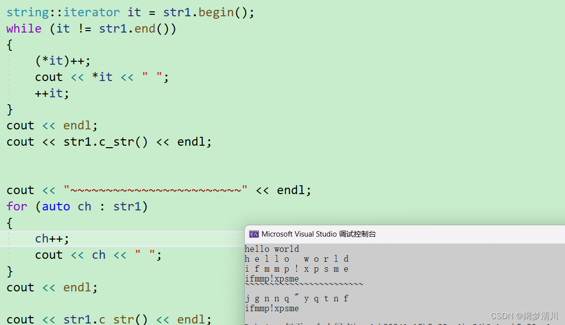 (2)通过下面这个例子我们就可以发现,这个范围for实际上不会对于这个str1进行实质上的修改,但是这个迭代器就是指针,是可以对我们定义的字符串进行修改的;