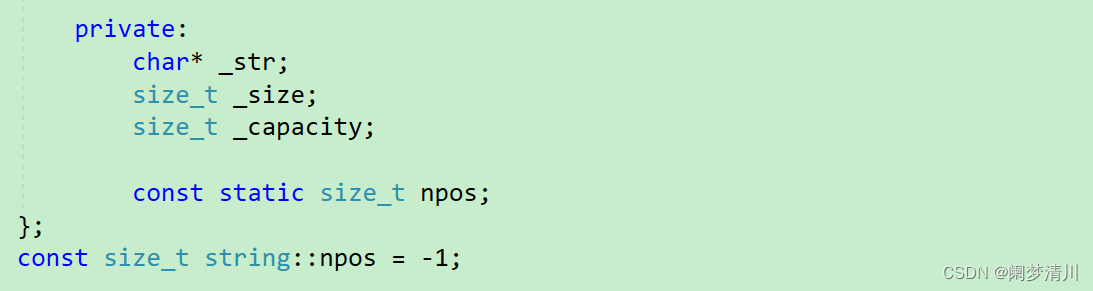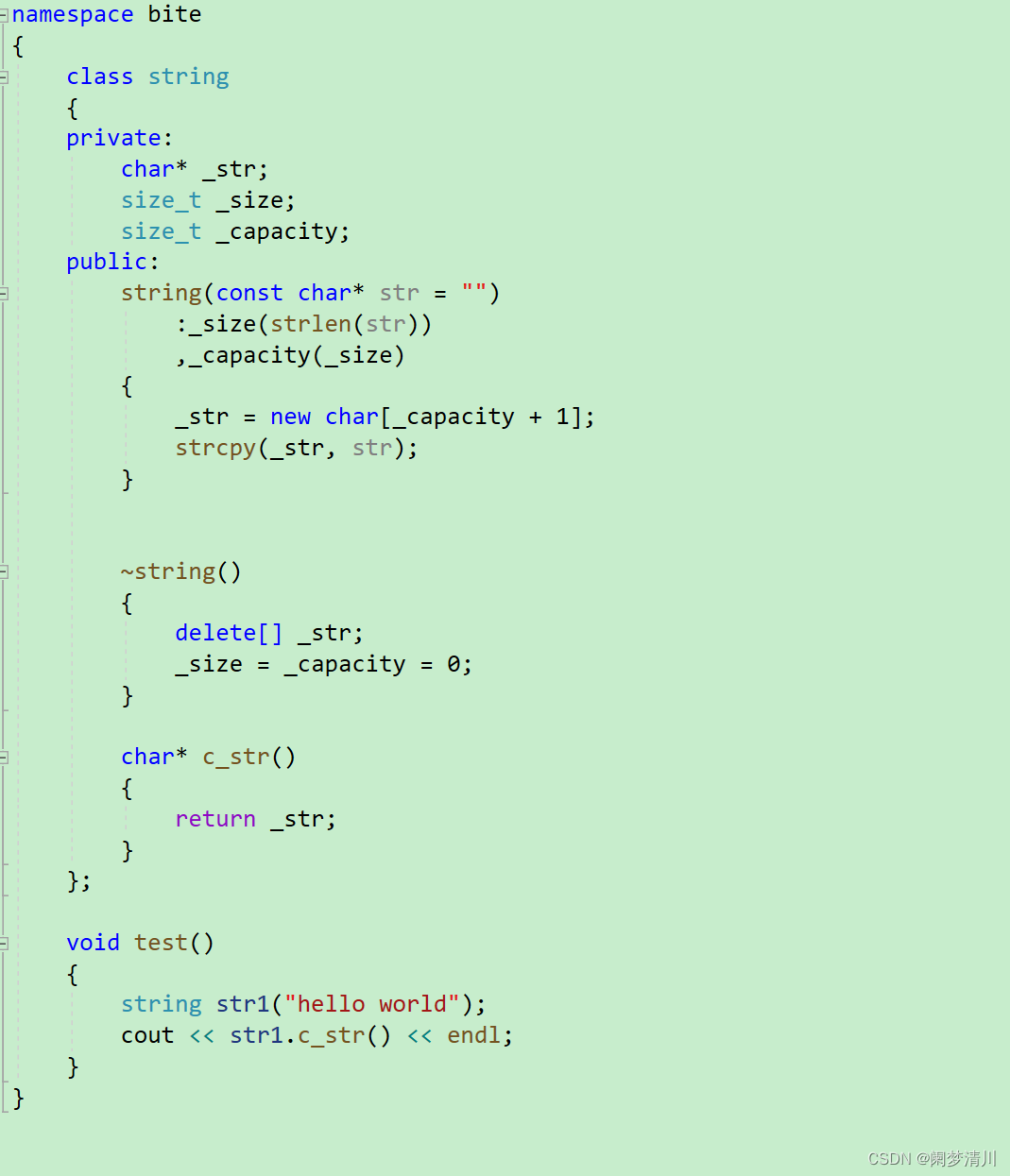 (2)capacity的大小始终是比这个size多一个的,这个就是为了斜杠0留足够的空间 ,使用这个new进行动态开辟空间,使用delete销毁空间,c_str这个函数就是为了打印我们的测试内容,其中这个里面的strcpy进行拷贝的时候是把这个斜杠0也会拷贝过去的;
