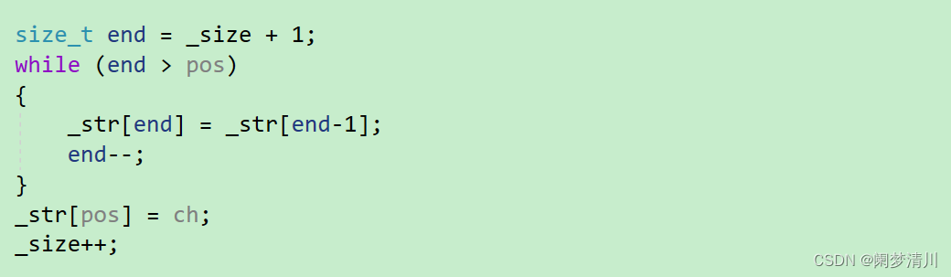这个函数就是用来在这个字符串里面的任意位置插入数据的,我们简单的逻辑如下,就是要一个一个的挪动数据;