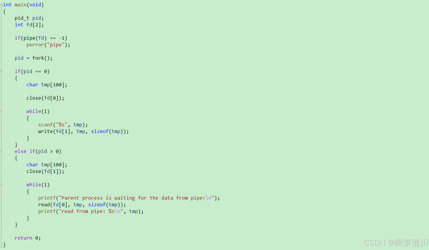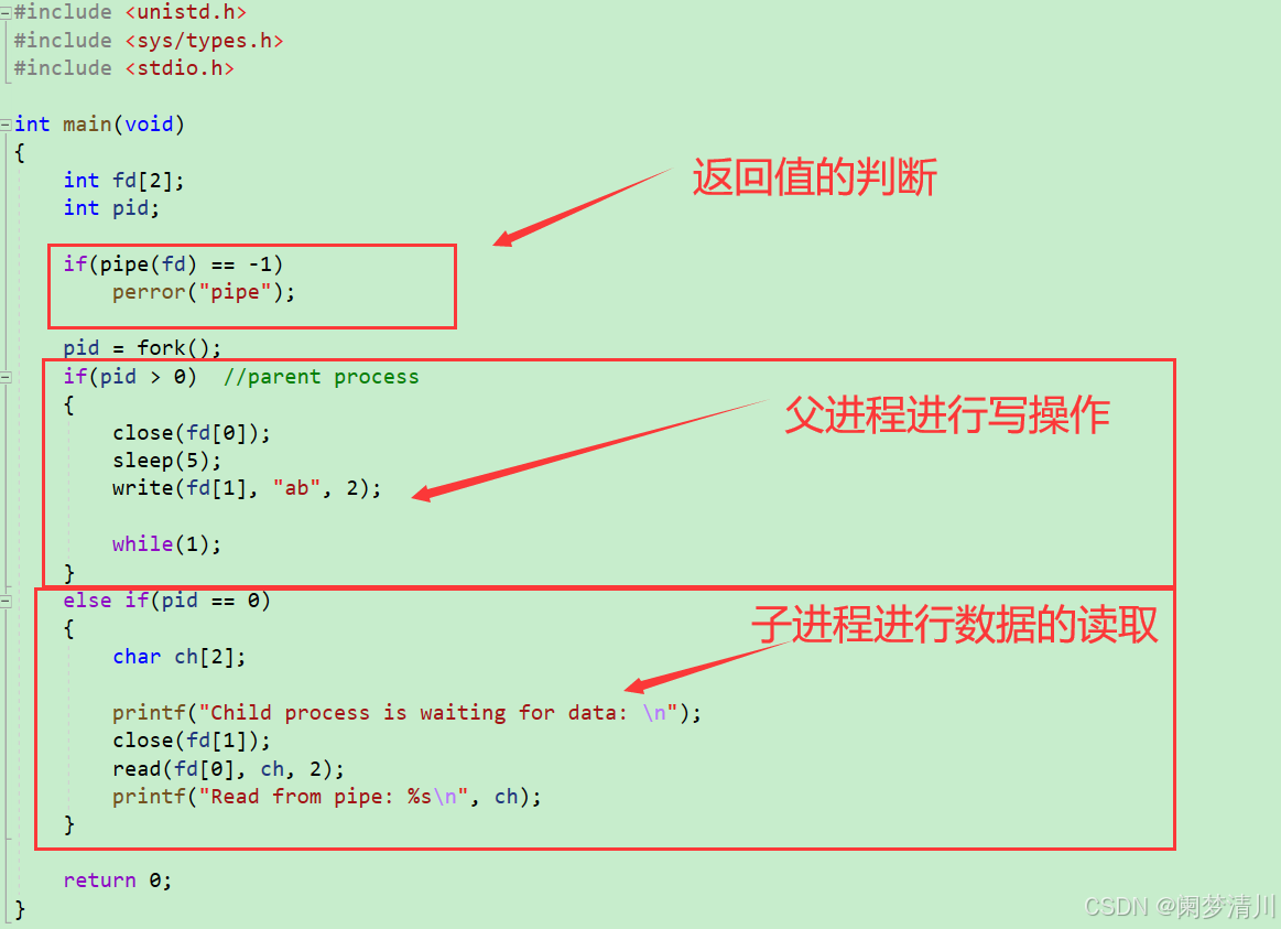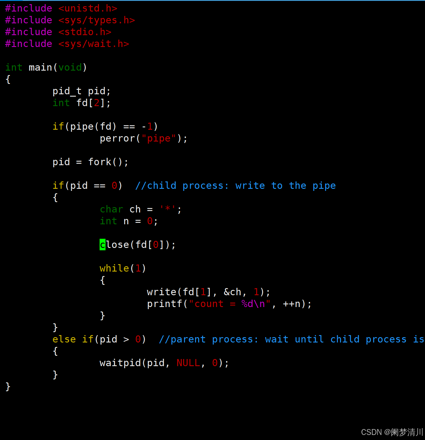 因为这个管道就是实现的父进程和子进程之间的相互通信,这时候我们调用之前学习的这个fork函数创建子进程,因为这个父进程返回的是子进程的pid,所以fork返回值是pid>0的时候,这个对应的就是父进程,我们对于这个父进程,这个进行的是写的操作,因此我们需要关闭第一个参数,就是pipefd数组的第一个参数,下标是0,close就表示这个只进行写端的打开;
