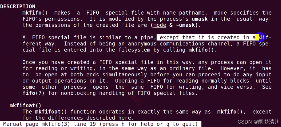 mkfifo函数创建的这个有名的管道本质上就是一个文件,毕竟这个linux下面一切皆文件,mode这个参数表示的就是这个文件的一个权限,也就是这个有名管道的一个权限,这个涉及到这个所属组等相关的概念,我们这个地方不详细介绍,可以自行系统学习,简单的讲,就是每一个都包含3个权限,读写权限之类的,使用数字进行表示;我们后面编写的这个函数使用666进行代替,这个里面的每一个6代表的都是一个具体的实际意义;