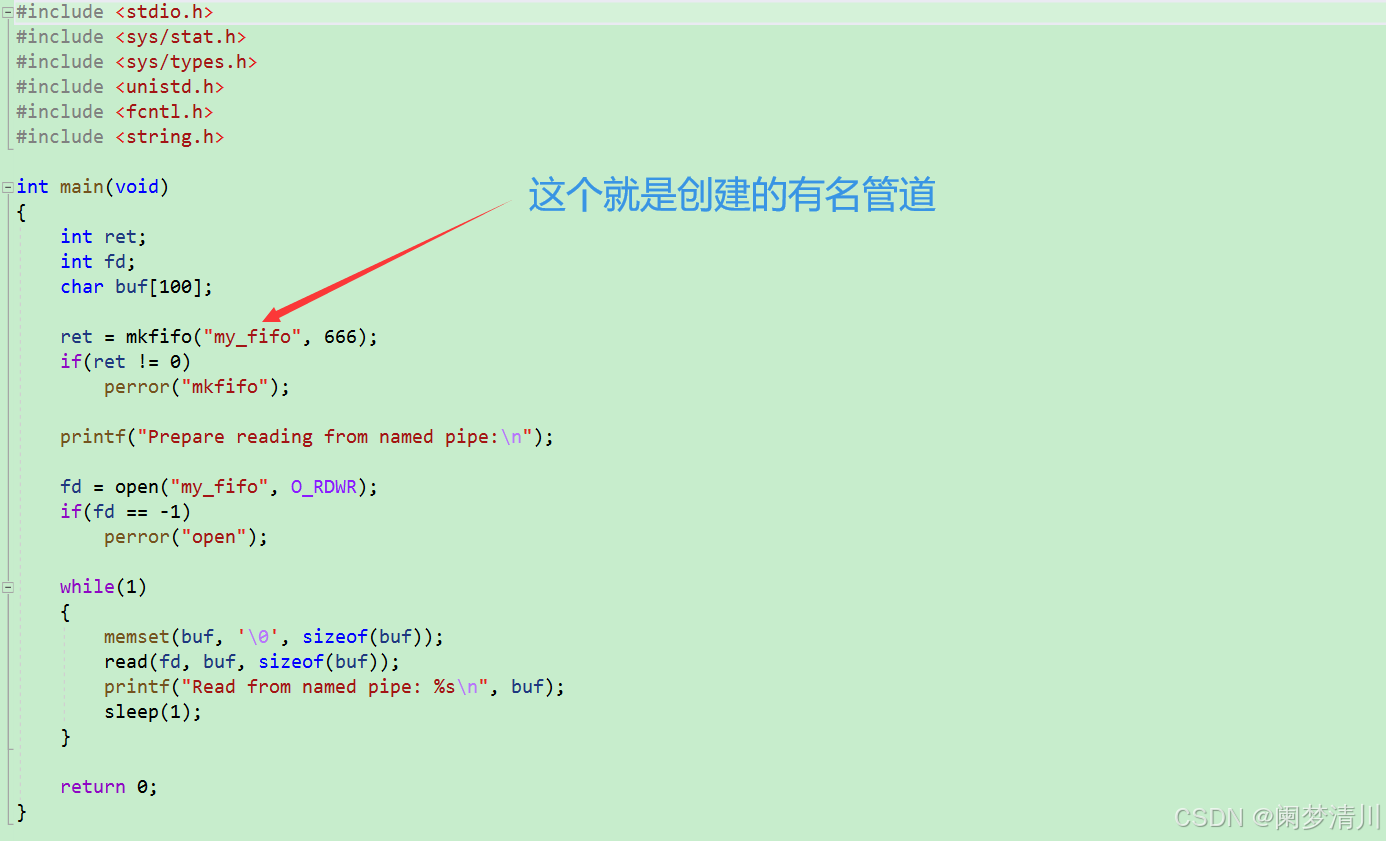 正常创建成功的时候,这个返回值就应该是0,当这个返回值不是0的时候,就说明这个函数的调用出现了问题,我们的这个时候有名管道里面没有内容,因此这个时候,我们的这个进程处于阻塞的状态,我们的read就是想要从这个管道里面读取数据,把这个读取的数据存储到这个buiff数组里面去;
