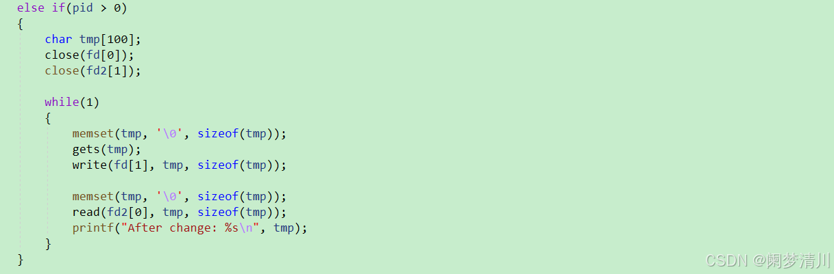 就是我们的一个管道的读取数据,写入到另外一个管道里面去,这个题目里面,就是父进程读取书,写到子进程这个里面去,因此,我们的父进程的写管道关闭,就是第二个参数,子进程的读取管道关闭,只需要被写入数据,也就是只需要保留第二个参数,因此我们把第一个参数关闭即可;