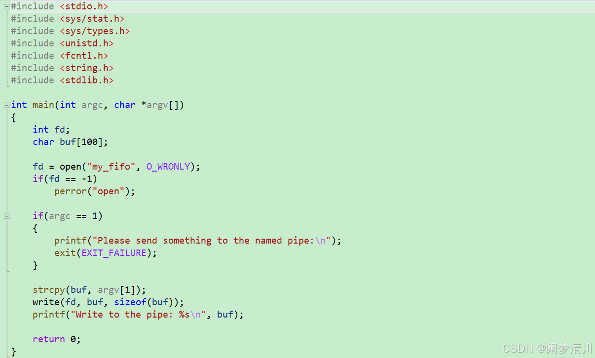 我们这个下面的代码就是一个进程向这个管道里面写入一些内容,使用的是有参数的main函数,把这个写的buf内容发送到这个管道里面去;