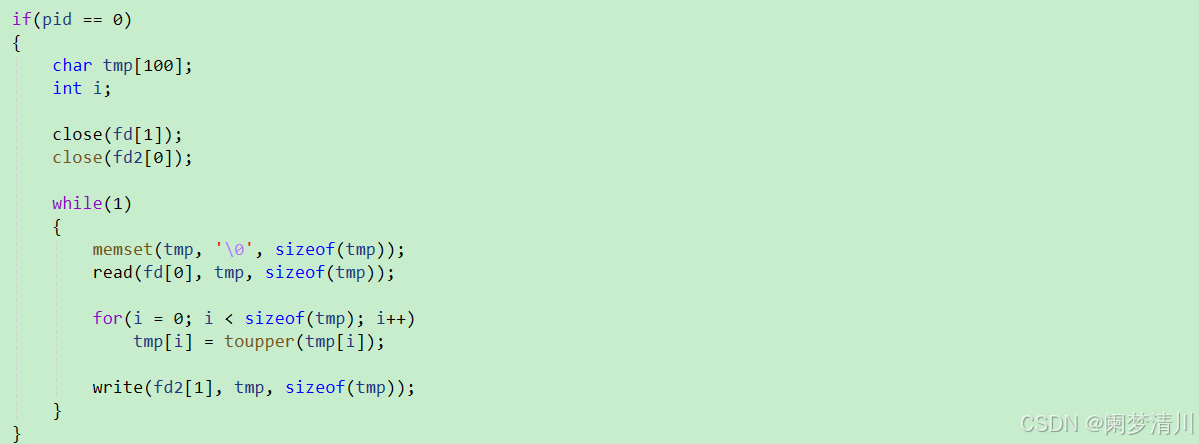 但是在这个问题里面,我们的这个是子进程把这个父进程的字符全部转换为大写的之后传递给这个父进程,因此这个时候相当于是这个子进程给出数据,写入到这个父进程里面去,我们的这个close里面的这个参数正好是和上面的相反的;