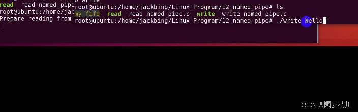 我们如何运行呢,下面的这个.write就是这个写内容的生成的可执行程序,我们向这个管道里面写入这个hello 之前这个上一个进程读取这个数据,因为这个有名管道里面没有数据,因此这个就会一直处于等待的阻塞状态,所以这个时候我们这边一点写入数据,那边的阻塞状态就会结束,把我们写入的数据读取到,从而结束进程;