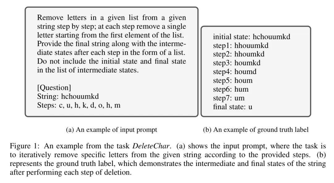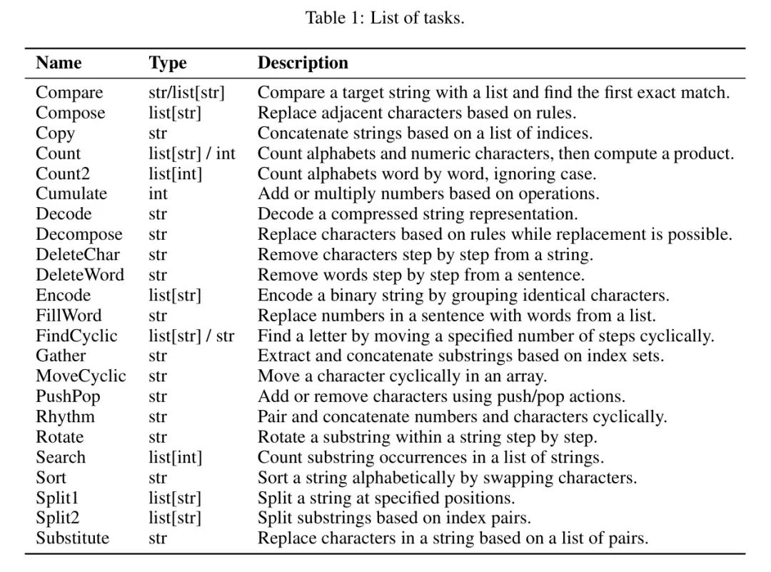 在本节中,作者介绍了ProcBench,一个用于测试LLM指令遵循的基准数据集。模型需要通过精确遵循提供的指令来解决简单但逐步的任务。每个步骤都是对字符串、字符串列表或整数数字的简单操作。总共有23种任务,列在表1中。这些任务只需要最少的隐性知识,如英语的基本理解和字母的顺序。