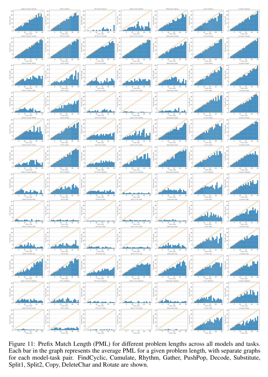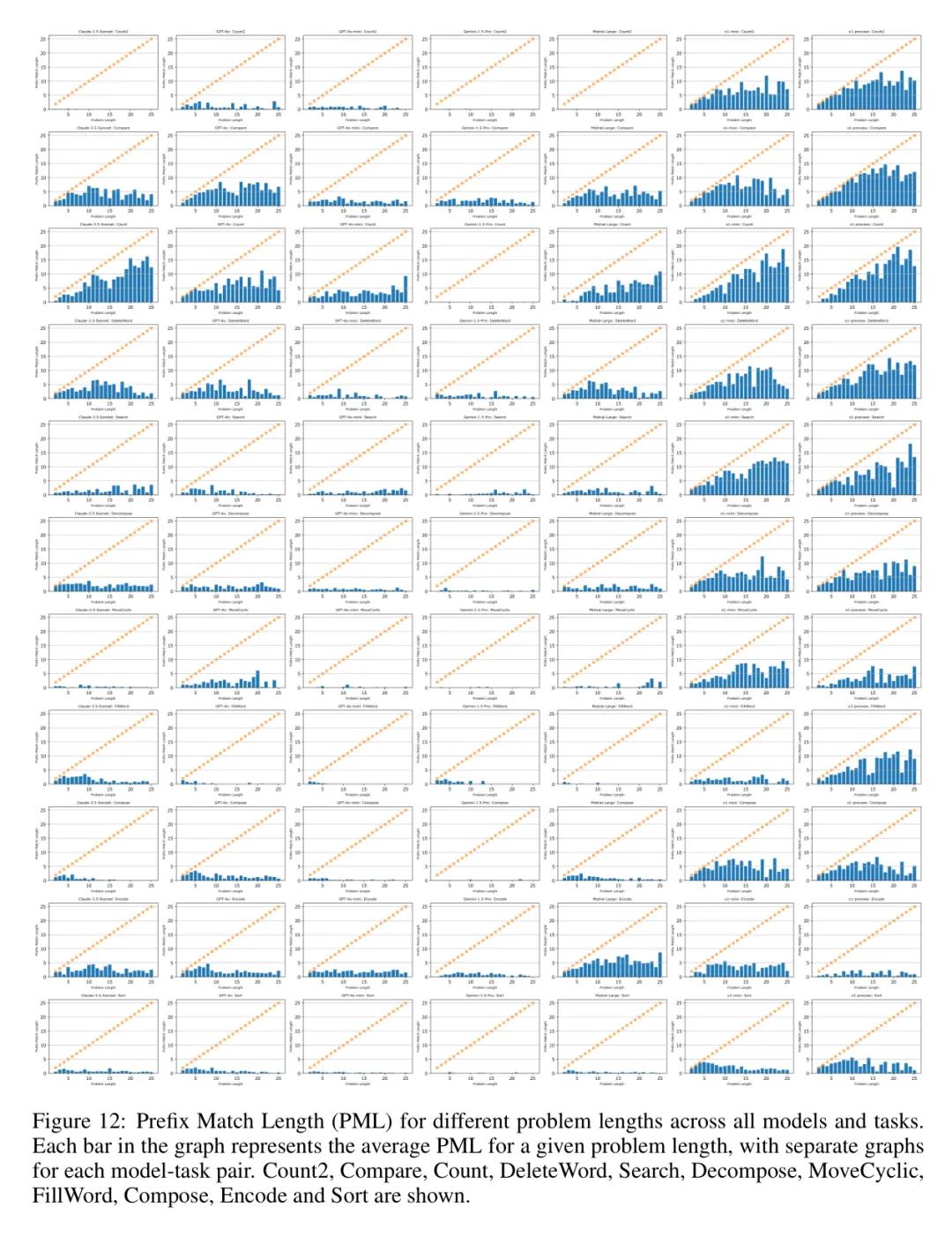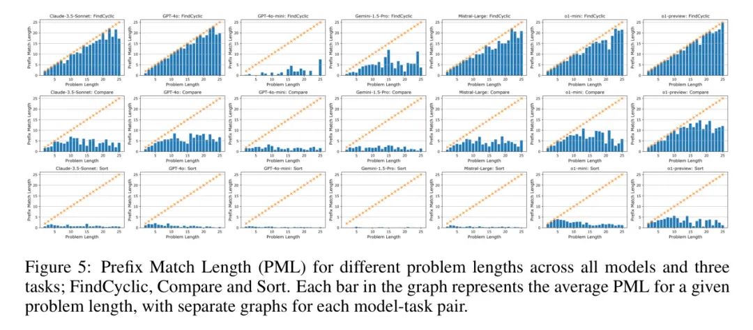 特定任务模型性能 为了进一步评估模型在特定任务上的准确性,图5说明了在任务如FindCyclic、Compare和Sort等上的PML。结果表明,一些模型在FindCyclic任务中始终保持高准确性,而在Compare任务中,随着步骤数的增加,它们的准确性显著下降。此外,像Sort这样的某些任务在步骤上始终显示出较小的PML值,这表明它们的困难性。所有图形均可在附录中的图11和图12找到。