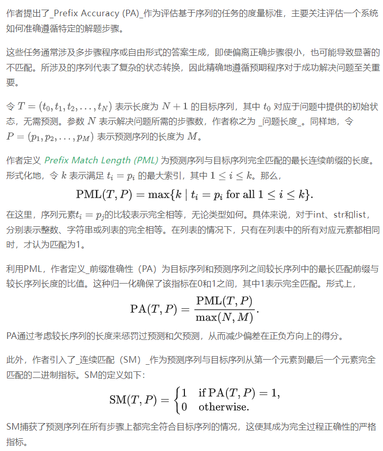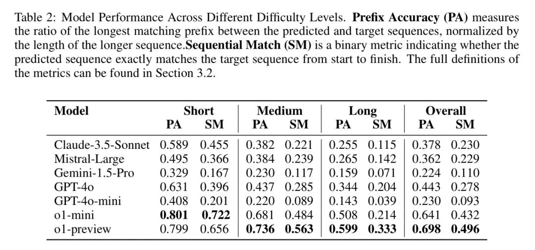 总结模型性能。表2通过PA(前缀准确性)和SM(顺序匹配)这两个指标,对在不同任务难度水平(短、中、长)下的模型性能进行了全面比较。o1-preview模型在大多数类别中始终处于领先地位,尤其是在中长任务中,它为PA和SM分别取得了最高分。相比之下,o1-mini在简单任务中具有竞争优势,在短任务中以0.801的PA和0.722的SM超过了o1-preview。