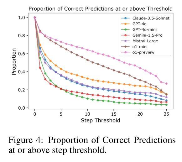 图4可视化了每个模型在给定步骤阈值或以上成功预测的正确问题比例。每个点表示模型在特定步骤阈值N以上成功预测的问题比例。类似于ROC曲线,曲线保持较高且向右移动的模型在具有较长序列的任务上表现出更强的性能。o1-preview和o1-mini表现优越,其曲线下降较为平缓,表明它们在有效处理较长步骤序列方面具有能力。相比之下,其他模型在5步左右的精确率急剧下降,反映了它们在扩展序列中维持正确预测的有限能力。
