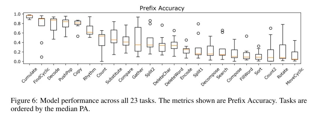 最后,图6展示了在数据集中的23个任务上,7个模型之间的准确率变化。值得注意的是,许多模型在FillWord和Sort等任务上都被认为是具有挑战性的,这些任务中的某些问题经常导致较低的PA。