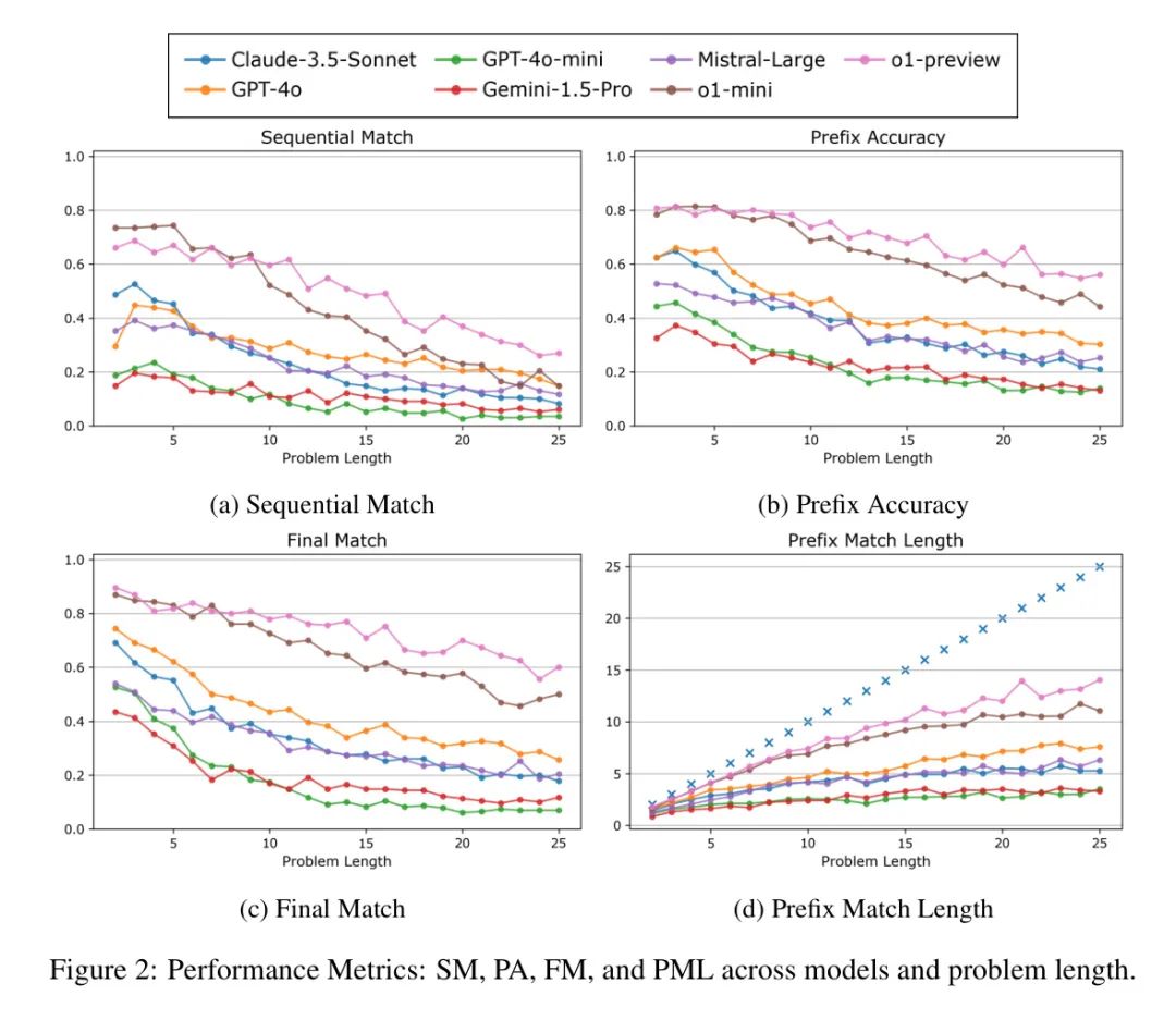 然而,随着序列长度的增加和复杂性的提高,即使这些模型也出现了显著的性能下降,突显了它们在处理复杂、多步推理时的局限性。