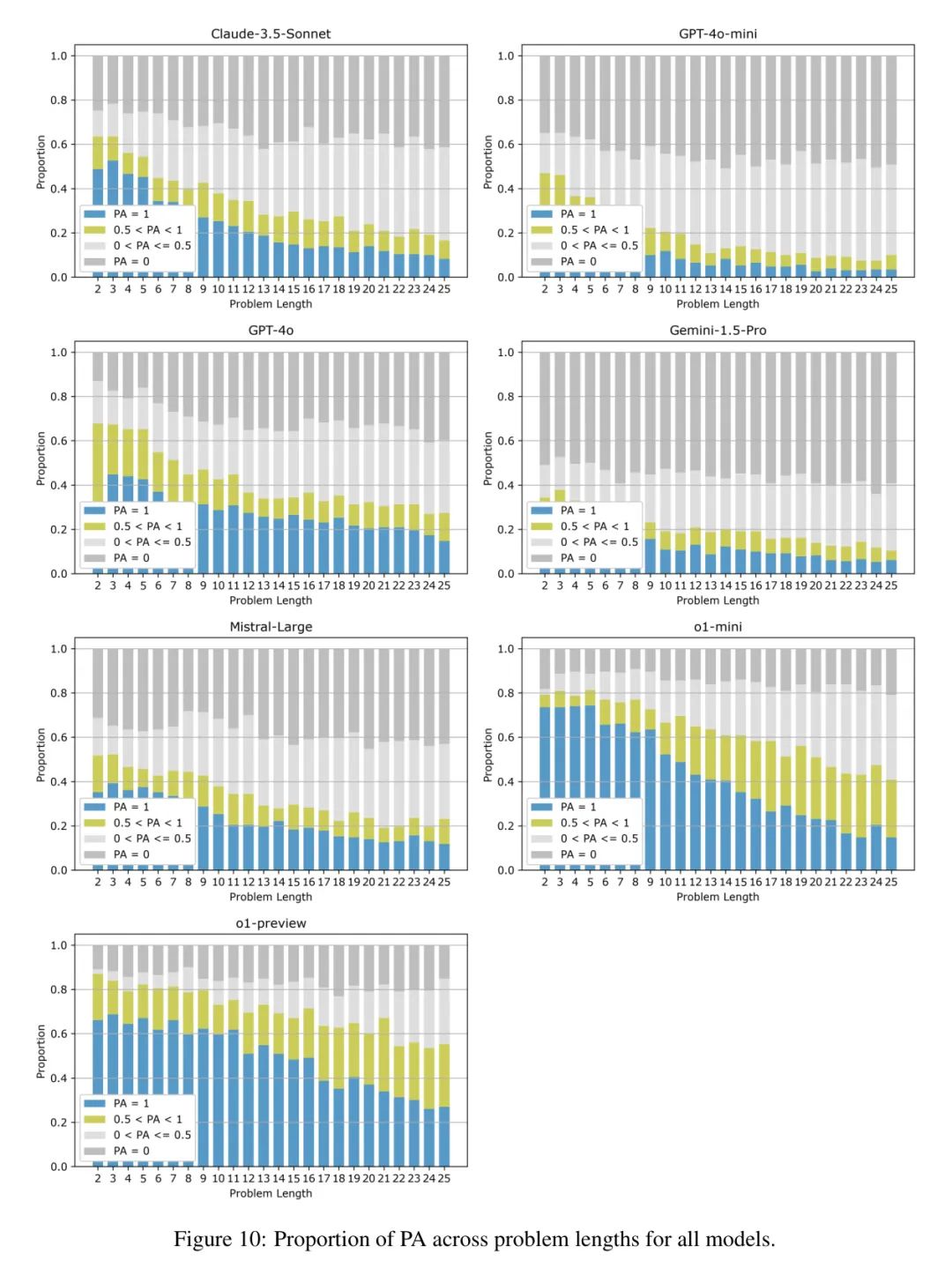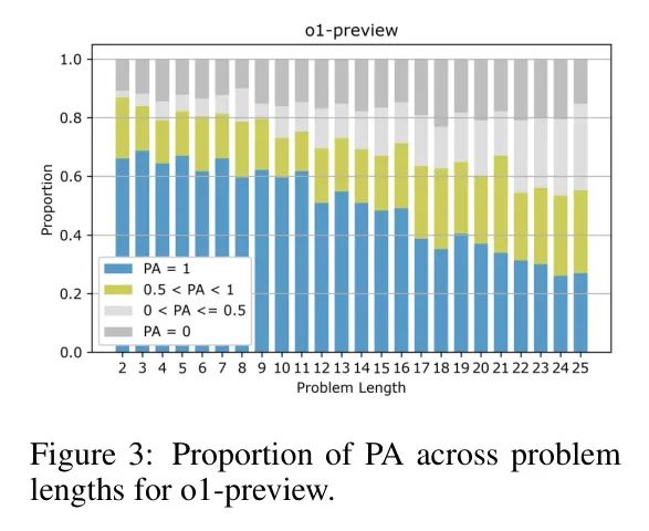 图3说明了在o1-preview模型(具有最高总体性能的模型)中,不同问题长度组中PA的分布。可视化结果表明,在问题长度不变的情况下,初始步骤的错误比例几乎保持不变。