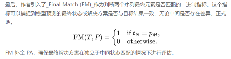 根据定义,SM是最严格的指标。确实,如图1(a)所示,随着问题长度增加,SM表现出最明显的下降趋势。尽管PA显示出与SM类似的趋势,但其下降趋势更为平缓(图1(b))。此外,PA遵循与PML相似的模式(图1(d)),但它的归一化允许在不考虑问题长度的情况下进行模型比较。FM最初是基于作者提出的任务的固有难度和普遍假设,即只需要正确计算最终答案。